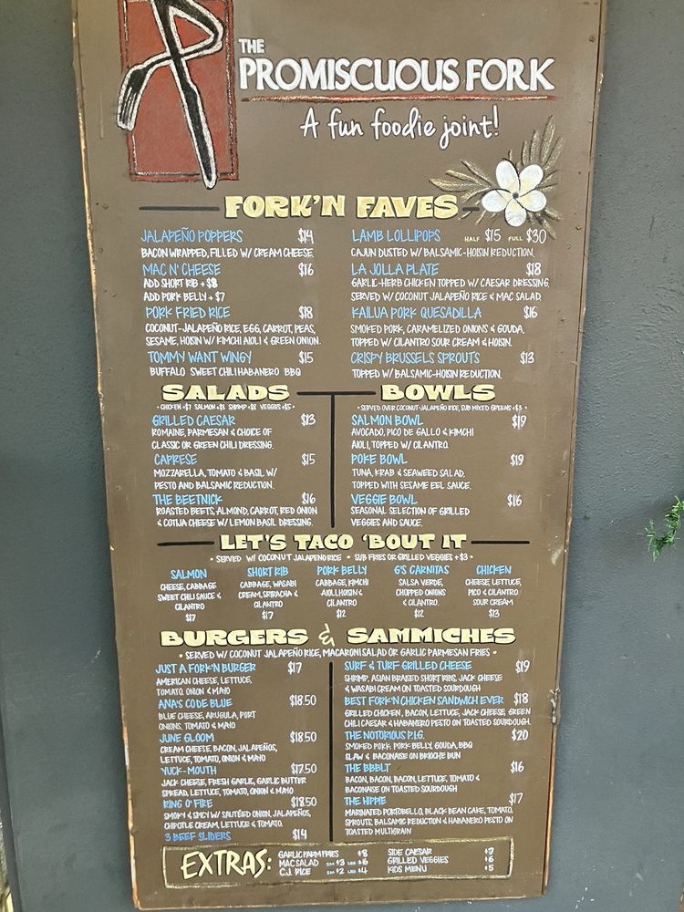 Welcome to The Promiscuous Fork, where American cuisine meets culinary creativity in the heart of La Jolla. Nestled at 6984 La Jolla Blvd, this charming eatery specializes in mouthwatering burgers that cater to a variety of palates, including generous vegan and vegetarian options. With a casual ambiance perfect for families or groups, you can enjoy lunch or dinner while indulging in Happy Hour specials.